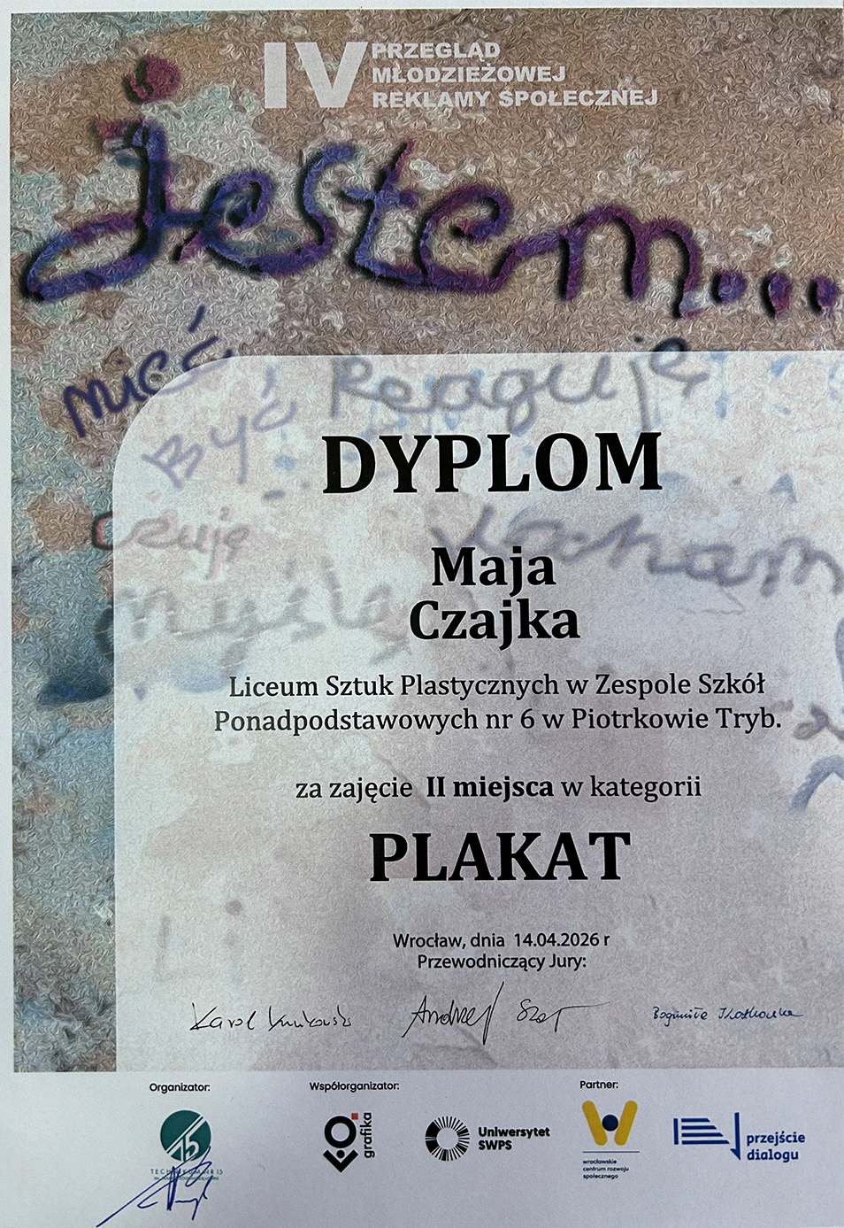 Z przyjemnością informujemy, że Maja Czajka, uczennica klasy 1P Liceum Sztuk Plastycznych (ZSP 6), została laureatką IV Przeglądu Młodzieżowej Reklamy Społecznej. Tematem głównym IV Przeglądu w czterech kategoriach było hasło „Jestem…”